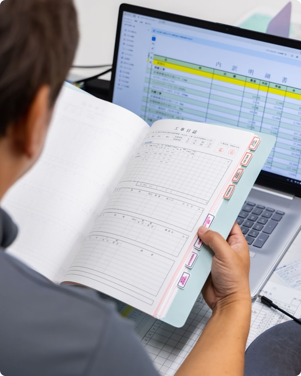 - 岩澤組には、今まで建設ディレクターというポジションはなく、各現場ごとに現場監督が現場のすべての業務を一任していました。しかし、私は書類作成における補助や、現場の進め方について、自分の経験からアドバイスをしていきたいと思っています。